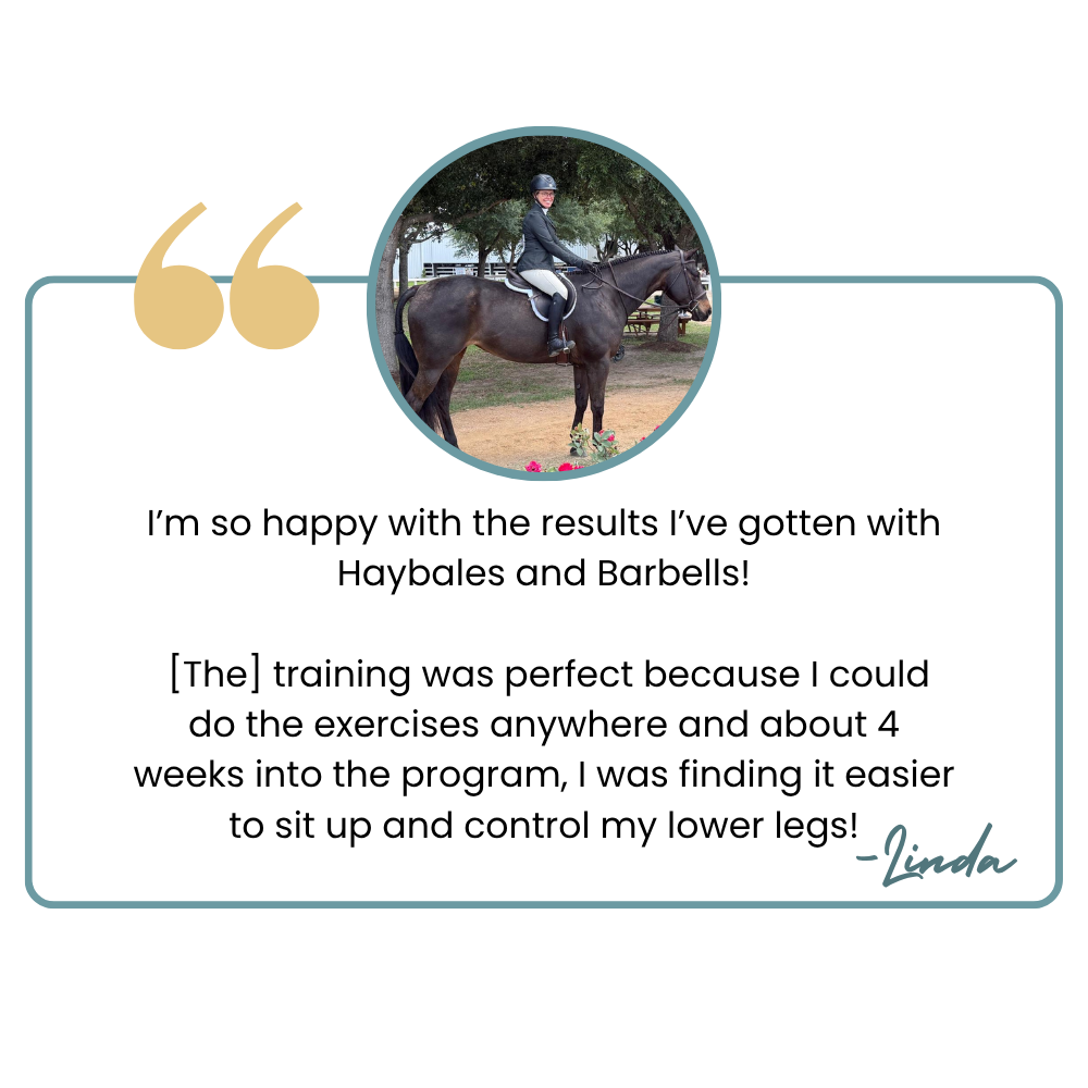 At Haybales and Barbells, we don’t measure progress by weight, looks, or diets. Instead, we focus on becoming stronger and more balanced riders for our horses and enhancing both mental and physical well-being.
